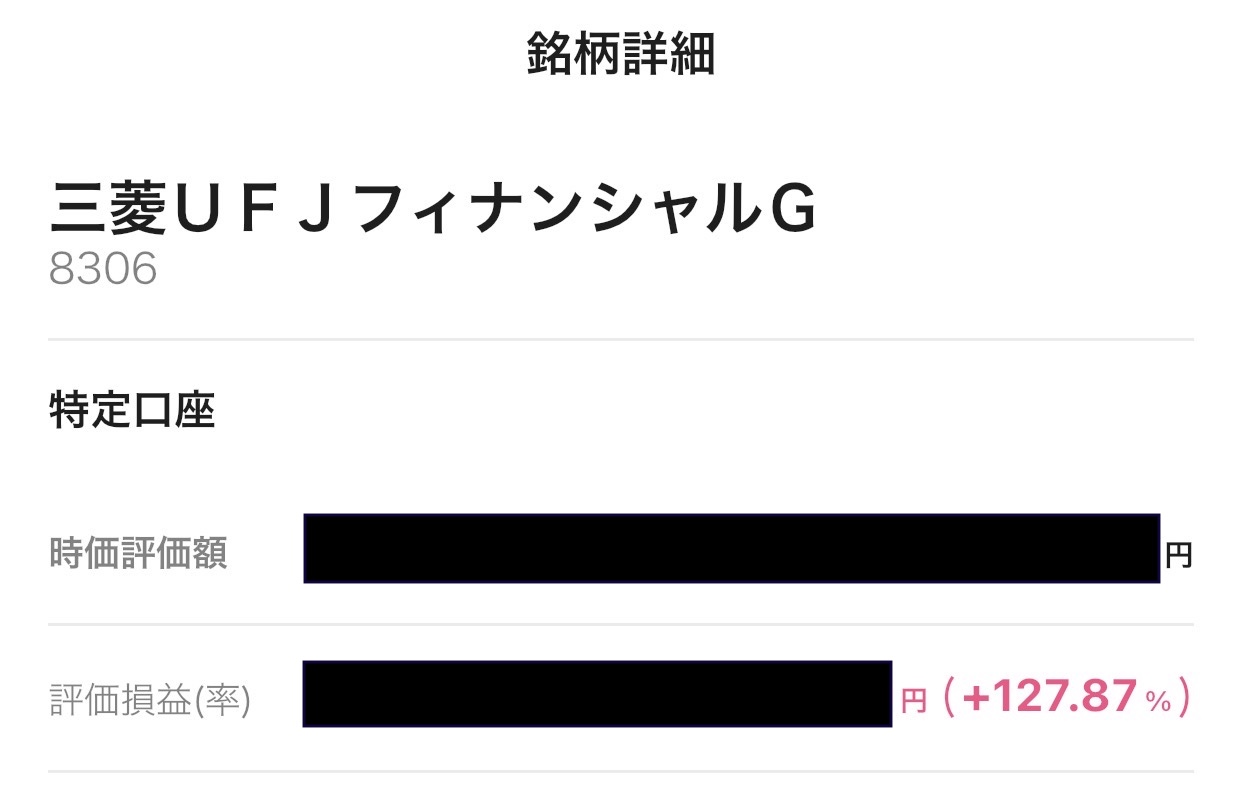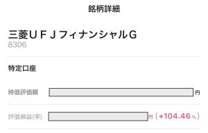 三菱UFJフィナンシャル・グループ(MUFG)の評価損益率が100%を突破しました